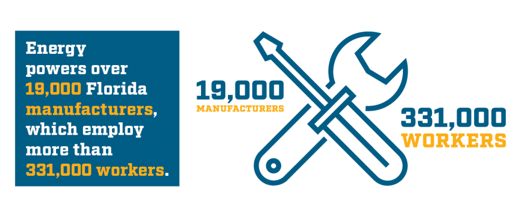 Energy is not only needed to manufacture parts for rocket ships and airplanes, it’s also needed to support Florida’s manufacturing industry in general. The state is home to over 19,000 manufacturers, employing more than 331,000 workers.6 It’s not just the aerospace and aviation industry that makes and produces things here; Florida’s manufacturing industry is very diverse and includes companies in traditional manufacturing industries, such as electronics, plastics, food processing, and printing. This means that without energy, Florida would be unable to produce its famous orange juice or cotton for clothing, parts for fishing boats and fishing rods,7 or your reliable Tervis tumbler.8 Without energy and the derivatives that come from it, Florida would also be unable to contribute the breakthrough technologies that manufacturers bring to life, such as lasers, photonics, and medical devices.
